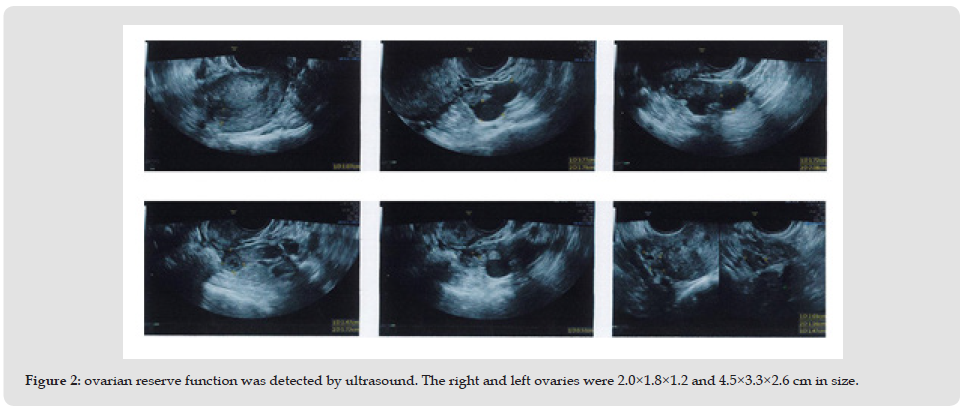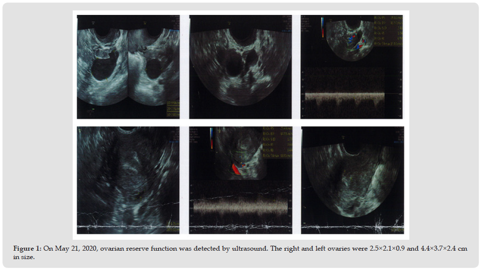 In modern society, the number of infertility cases is increasing due to the increased pressure of life, delayed childbearing age and change in diet structure, which seriously affects the physical and mental health of women. Infertility is a common reproductive disease in women, mainly due to ovarian and pelvic factors, such as cystic ovary syndrome, premature ovarian failure, hyperprolactinemia, fallopian tube abnormalities, endometriosis, endometrial inflammatory adhesions, and endometrial polyps [1,2]. Premature ovarian failure (POF) is a disease characterized by amenorrhea, infertility, estrogen deficiency, follicular reduction and elevated gonadotropins before the age of 40 [3]. The incidence of POF is 1-3%, and the incidence has been increasing in recent years [4]. Women with POF may be at increased risk for osteoporosis, cardiovascular disease, and dementia [5]. In addition, POF has been reported to lead to a range of health problems such as depression, anxiety and impairment of marital quality of life and sexual function [6]. The etiology of POF is complex and has been reported to be related to autoimmune reactions, infections, genetic factors, medical effects of treatments such as surgery, and endocrine dysfunction [7]. According to its clinical manifestations, it mostly belongs to the category of «premature breakage of menstrual flow», «menorrhagia» and «blood withering» in Chinese medicine [8]. Endometriosis is a common gynecological disease in women of childbearing age. About 80% of ectopic endometrium invades ovarian tissue, and the cysts are also called ovarian chocolate cysts because of their dark brown, chocolate-like paste of old, bloody fluid [9]. There is no specific record of ovarian chocolate cysts in Chinese medicine, but according to their clinical manifestations, they can be classified as «zhengjia» and «infertility» in Chinese medicine. Here, we report a patient with both premature ovarian failure and ovarian chocolate cysts, in which the patient had a very low probability of pregnancy. Due to her strong desire to have children, the patient successfully delivered a healthy baby under our integrated Chinese and Western medicine treatment.