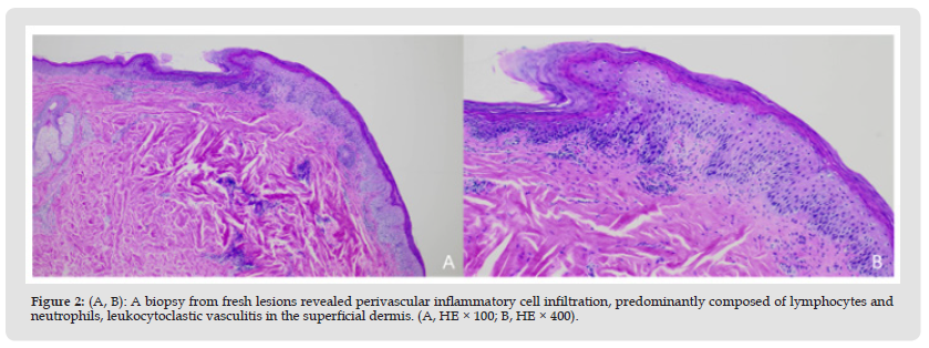 Figure 2 (A, B): A biopsy from fresh lesions revealed perivascular inflammatory cell infiltration, predominantly composed of lymphocytes and neutrophils, leukocytoclastic vasculitis in the superficial dermis. (A, HE × 100; B, HE × 400).