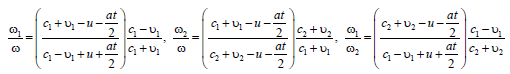 The second of these relations shows that a change in the frequency of a wave that has passed through the interface between media is observed only if these media have different wave propagation speeds c1 (≠) c2 . If the medium on both sides of the interface is the same, then the frequency of the transmitted wave does not change 2 ω =ω . In this case, if the interface between the media moves in the direction of propagation of the incident wave (velocities u and c1 coincide in direction, that is, the interface “runs away” from the wave), then the frequency of the reflected wave is less than the frequency of the wave. In the more general case of uneven motion of the interface between media ( a ≠ 0 ), the dependence of the relative change in the frequency of reflected and transmitted waves through an accelerated moving interface (at u/c=0.1 and u/c=0.2) on the parameter at is described by the relation (4 ) and is shown in Figure 2. The frequency shift due to the Doppler Effect depends only on speed and does not depend on time. The frequency shift occurring due to the accelerated movement of the interface becomes decisive after a time interval t~u/a even at a small acceleration a, when it reaches the value at~u. Accounting for both boundary conditions (2) gives a system of equations for determining the amplitudes of the reflected and transmitted waves, which takes the form: