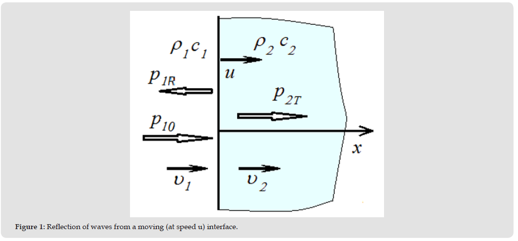 where a is acceleration. Note that the dependence of the change in the frequency of the reflected wave on the magnitude of the acceleration for the problem of accelerated approach of the source and receiver of radiation was considered by Ritz, who discovered its difference from the Doppler Effect [31-33]. In the case of accelerated motion of the boundary, the effect of changing the frequency of the wave reflected from it (and differing from the Doppler Effect) can be called the Ritz effect. The possibility of a more general case of uneven movement of the interface between media, when the coordinate of the interface between media is described by the function x (t ) = ∫u (t )dt , where u (t ) is the speed variable in time, requires a separate description. For elastic waves, physical processes are expressed more clearly due to the comparability of wave speeds and the speeds of movement of media and interfaces observed under normal conditions. For electromagnetic waves, in particular light waves, these effects, due to the high speed of light, will appear over long periods of time or when waves propagate in slow-moving media and structures. Let there be an acoustic medium to the left of the boundary (Figure 1), characterized by the density ρ1 and speed of propagation of waves in the medium c1 , and a medium with similar parameters, respectively ρ2 , c2 ,to the right. Without dwelling on the question of the practical feasibility of the model, for generality we assume that each of these media can move along the 0x axis with speeds υ1 and υ2. In this case, each of the media carries away the wave process with its movement. Then the speed of propagation of waves along the axis (forward waves) in the first medium is equal to c10 = c1 +υ1 , and the speed of propagation of waves in the opposite direction (reverse waves) is equal to c1R= c1 −υ1 . In the second semi-infinite medium, waves (passing through the interface between the media) propagate waves only in the direction of the 0x axis with speed c2T = c2 +υ2 . There are no waves in the opposite direction.