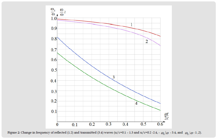 Relation (4) relates the frequencies of the reflected wave 1 ω and the wave that passed through the interface between the media 2 ω , with the frequency of the incident wave. In previous studies [1-3], they were limited to analyzing the case of a constant speed of movement of the interface between media (Doppler Effect) (u = const ) , in which the change in the frequency of reflected waves does not change with time. This approximation is mainly used in practice.