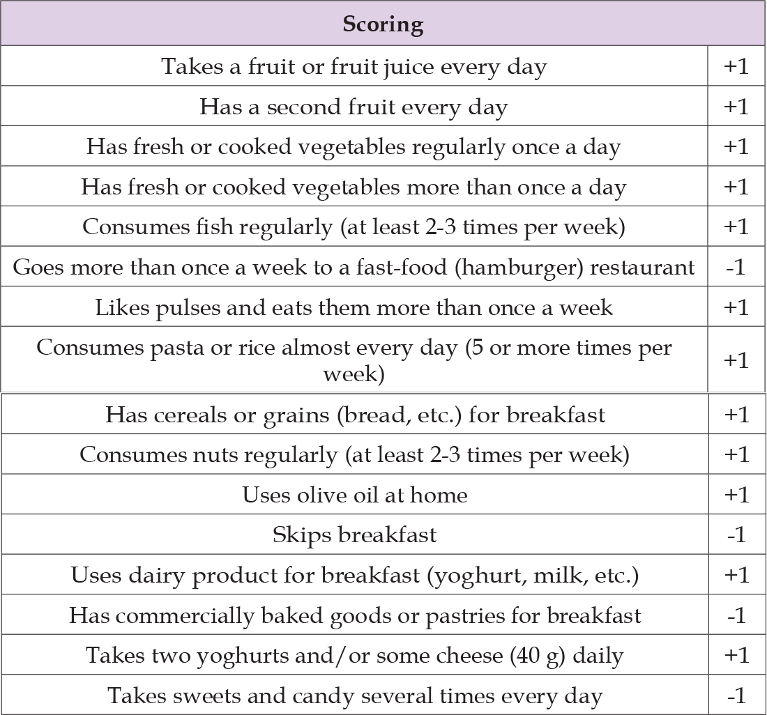 Two validated score systems were selected: the KIDMED index [24,29], easy tool suitable for our sample, and the MDSS [26], based on the frequency of consumption of foods and food groups, in absence of information on nutrients and quantities in grams of foods. It was calculated based on the food items of the FFQ, which in a later time have been gathered into 13 items, according to the MD pyramid [1]. The KIDMED Questionnaire: The KIDMED questionnaire could be self-administered or conducted by trained interviewers and consists of 16 dichotomous (positive/negative) items, where the 4 questions denoting a negative connotation to the MD are scored with -1, and the 12 questions denoting a positive connotation are scored with +1 (Table 1). The score obtained summing the single answers let to classify the adherence to MD into three levels: low (≤ 3), medium (4–7), high (≥ 8) [24,29].