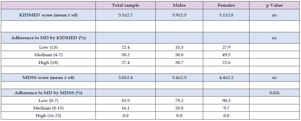 The aim of this paper is to compare two different methodologies used to assess the adherence to MD in a sample of adolescents: the KIDMED index [24] and the MDSS [26]. Our results describe a sample of adolescents with a mean KIDMED score indicating a medium adherence to MD and a mean MDSS score indicating a low adherence. Most of volunteers are differently distributed among the three levels of MD adherence evaluated with the two indexes. According to KIDMED questionnaire, the 27.4% of our sample has a high MD adherence and 50.2% a medium adherence. A systematic review [30] conducted on participants 2–17 years old, shows that the KIDMED questionnaire is the method most often used, also for the Italian adolescents. In the study conducted by Bonaccorsi, et al. [31] on 314 volunteers aged 6-14 years old, high adherence is found in 24.8%, medium adherence in 56.4% and low adherence in 18.8% of the sample.
