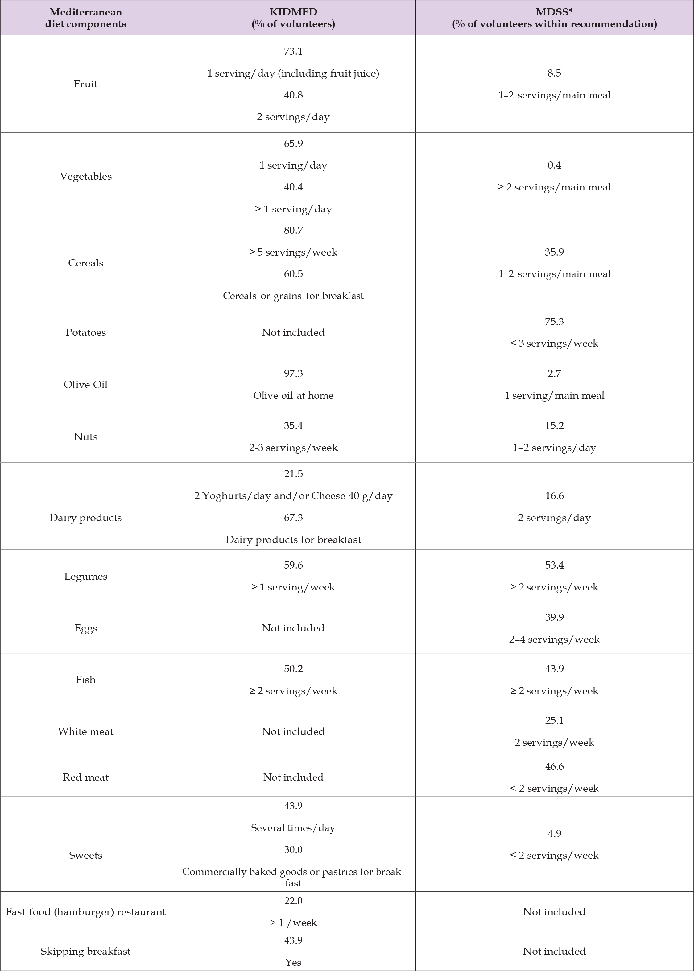 However, the KIDMED questionnaire considers different aspects respect to MDSS: a lack of uniformity in the components of the diet between the two measures and, even within the same food group, the number of servings differs markedly among the indexes. Anyway, it is important to underline that, in our study, the answers relating to food consumption are congruent between the two methodologies, because they were immediately checked in the presence of the subject to avoid inconsistent reporting. The first obvious discrepancy between the two methodologies is that in the MDSS only fruit consumption is mentioned (1-2 servings/main meal, i.e. 3-6 servings/day), while in KIDMED fruit is associated with fruit juice consumption. According to the KIDMED questionnaire, 73.1% of volunteers consumed 1 serving/day of fruit (including fruit juice) and 40.8% consumed 2 servings/day, differently from the 8.5% of the sample within fruit recommendation according to MDSS: some volunteers answered positively to the first question of KIDMED as they consumed fruit juice and not fruit, data confirmed by the FFQ.