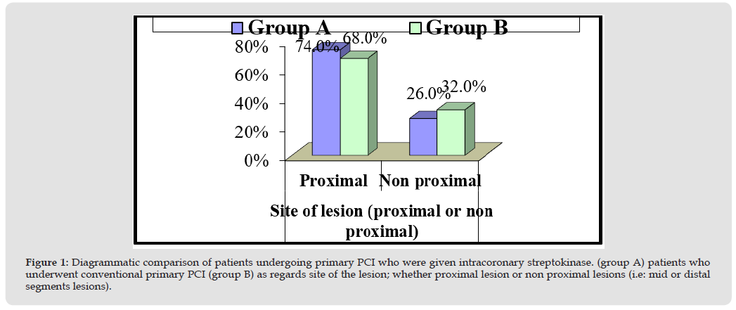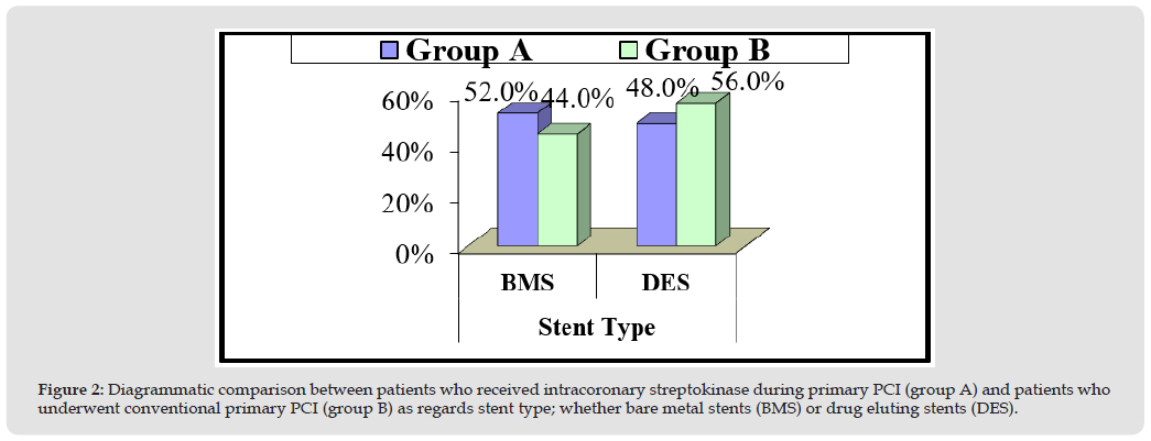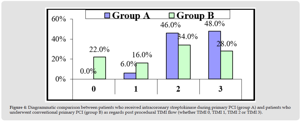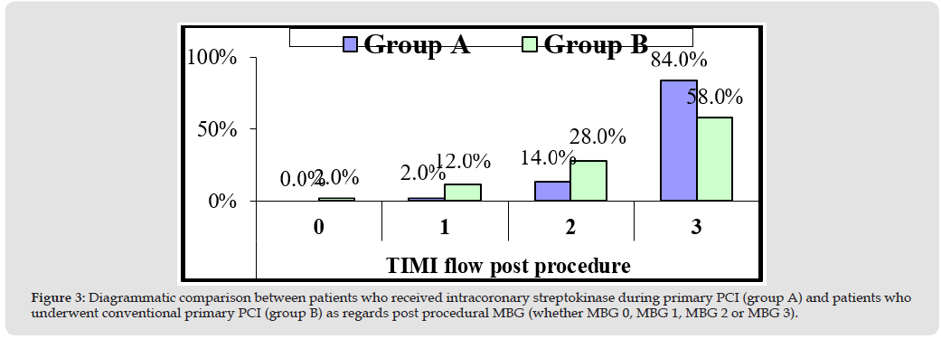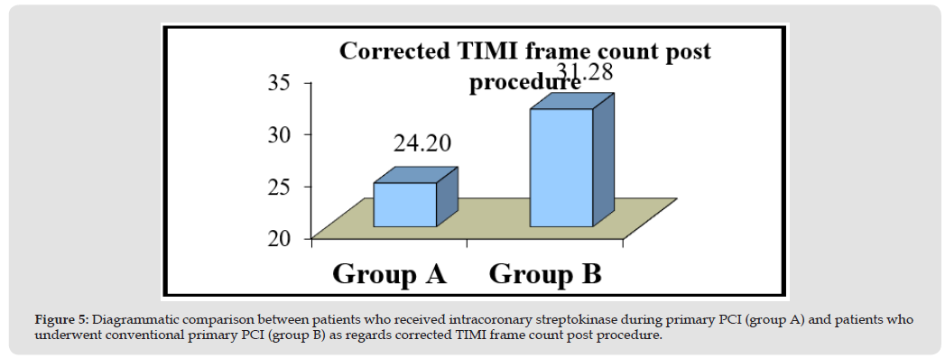 It included 90 patients who underwent conventional primary PCI without receiving intracoronary thrombolytic (Figures 1 & 2). Then, both groups were compared as regards the primary end points (angiographically: post procedural TIMI flow, post procedural MBG and corrected TIMI frame count and electrocardiographically: S-T segment resolution score) as shown in Figure 3, and represented diagrammatically in Figures 3-5. Both post procedural TIMI 3 flow and MBG 3 were statistically significantly higher among patients of group A (P-values = 0.026 and 0.001 respectively), mean corrected TIMI frame count was statistically significantly lower among patients of group A (P-value= 0.000), while S-T segment resolution score > 70% was yet higher among patients of group A, but not statistically significant (P-value=0.22) (Figure 6).