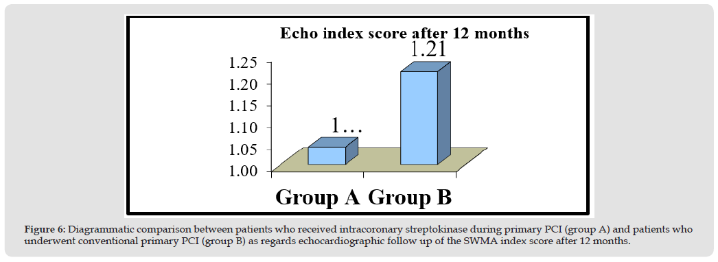 In certain circumstances, the operator may decide to employ additional techniques, such as an aspiration device or glycoprotein IIb/ IIIa inhibitors, to finish the treatment since the patients’ angiographic findings were not adequate. Following primary PCI, the quality of reperfusion and the efficacy of revascularization were evaluated electrocardiographically using the S-T elevation resolution score, angiographically using the TIMI flow grading method, myocardial blush grade (MBG), and corrected TIMI frame count (cTFC). The patients had echocardiography and serial evaluation of serum biomarkers while they were in the hospital. Six and twelve-month follow-up appointments comprised clinical examination and repeat echocardiogram to measure segmental wall motion abnormalities (SWMA), left ventricular ejection fraction (LVEF), and SWMA index score. Transthoracic echocardiography was used to calculate the SWMA index score. Each myocardial segment is given a score between 1 and 4, with 1 denoting normokinetic, 2 hypokinetic, 3 akinetic, or 4 dyskinetic. Then, the total of the previously indicated segmental values is divided by 16 (the number of myocardial segments) to obtain the wall motion score index; hence, a SWMA index score of 1.0 (16/16) is regarded as normokinetic.