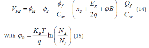 From this last equation and Figure 6, we can see that the difference between the C-V curves increases with decreasing oxide thickness. Indeed, the more the thickness of the oxide decreases, the greater the quantum confinement effects, thus leading to a strong overestimation of the capacity (Figure 7). The work output of the TiN electrode will be determined from the value of the flat band voltage using the relationship Eq. (14):