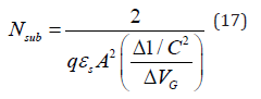 In this part, we present a modeling to simulate the effect of substrate doping on the C-V characteristic of our TiN / Al2O3 (5nm) / p-Si structure for a surface of 100*100um2 and at high frequency 1KHz. The deformations of the C-V curves generated by various doping values are presented in Figure 10. The uniformity of the insulation thickness over the entire surface of a wafer (silicon wafer) is a key parameter to guarantee the same characteristics electrical connections from one component to another. This curve shows the evolution of the C-V curve as a function of the doping of the substrate. The parts of the C-V curve that depend only on substrate doping correspond to the substrate depletion and inversion regime. On the other hand, the accumulation regime is not affected by this variation in the doping profile. The voltage of flat bands varies with the variation of the doping value on the C-V characteristic of the MIS structure. The Nsub doping concentration of the substrate is related to the inverse of the slope of the 1/C2 curve as a function of the VG voltage. The doping concentration is calculated by [9] (Eq. (17)):