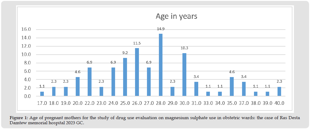 As shown in Figure 1, From 87 patient chart reviewed the minimum age of mothers was 17 and the maximum age was 40 years with median age of 27 years. And 26.5% of the mothers were within the range of 15-24 years of age, the majority of mothers were within the range of 25-34 years of age (61%) and the remaining 12.5% of mothers were within the range of 35-40 years of age. From the total charts reviewed only 16.1% of the charts had a documentation of the mothers’ weight. When the pregnancies are classified based on gestational age; 13.8% were less than 28 weeks, 42.5% were in the range of 28- 37 weeks of gestation, 37.9% were in the range of 37-42 weeks, and there were no pregnancies above 42 weeks of gestation. And 5.7% of the pregnancies were of unknown gestational age by date or estimation. 41.4% of the mothers in this study were primigravida while the rest 58.6% were multigravida. From the total charts reviewed 5.7% of the mothers had previous history of pre-eclampsia/eclampsia and 1.1% had concomitant disease which was Gestational Diabetes. The diagnosis of mothers in the study period were categorized in as mild pre-eclampsia, sever pre-eclampsia and eclampsia which were 9.2%, 83.9% and 6.9% respectively. There was no mother who developed eclampsia after admission. 80(92%) of the mothers had an indication. (5.7%) mothers were assessed to have pulmonary edema and all of them were given Furosemide injection. As shown in figure 2 below, 21 (24.1%) of the mothers were Nifedipine co-administered with MgSO4 from which none of them had developed a drug-drug interaction (Figures 3 & 4).