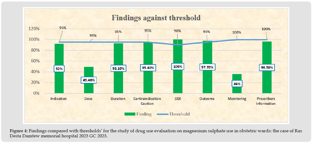 The outcome of treatment showed that 85 (97.7%) of the mothers were discharged improved. While only 2(2.3%) mothers got worsened and refereed to tertiary hospital. This finding is above the set threshold which was 95%. This result shows that MgSO4 is an effective choice of medication for the control of seizures in PE/E. Urine output and DTR were monitored for 82(94.3%) and 37(42.5%) patients respectively. While Respiratory rate was monitored for all mothers. On this study we found that a significant drawback exists in the monitoring of patients taking MgSO4. Mothers monitored for all the three parameters were 36(41.4%) which is below the set 100% threshold. The assessment of Prescriber’s information showed that prescribers full name and qualification were written in 86(98.9%) and 85(97.7%) respectively. While signature and date of prescribing were recorded in all of the charts [5]. Orders with all the four parameters recorded were 96.5% which is below the set 100% threshold.