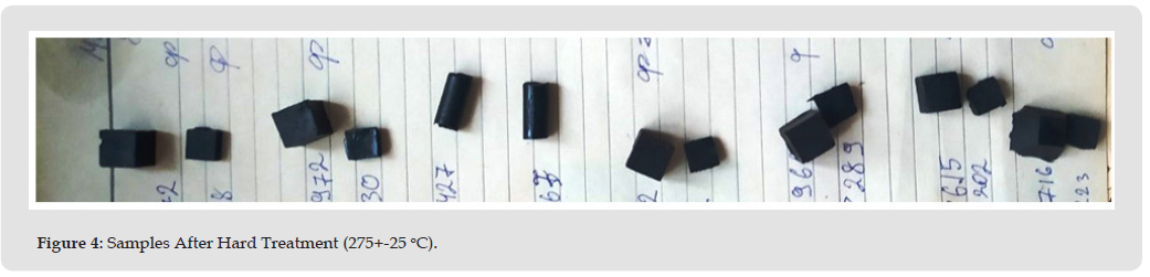 It is important that we do not have a collapse in strength, but only a decrease in ≈1,5 times. After hard heating, all the samples are carbonized (Figure 4). But unfilled sample keeps the compression strength F at the original untreated level (Table 3). Oil samples change F in different ways. For 5P (5 wt% of refined), the indicator increases even to the level of unfilled (without warming it was much lower, ... kgf/cm2). Also, the 20P sample (with 20 wt% refined oil) shows a significant increase after special heating, while the 20HP practically does not change the indicator. Such interesting effects can be called “thermostrengthening” of epoxy plastics. Regarding it, there are publications on epoxy-iron , epoxy-carbide and epoxy-gypsum compositions [7-9]. But epoxy-oil composites theoretically do not have solid microparticles, heat-resistant inclusions and other that can give such strengthening. This strange fact can be explained by the fact that weak and fast-burning inclusions disappear at 275 oC, and the polymer network has not yet destroyed, and therefore we have amplification. Obviously, this can only happen at certain optimal dilution concentrations. Indeed, at 33%, and especially at 10% dilution with both oils, heating leads to a decrease in strength.
