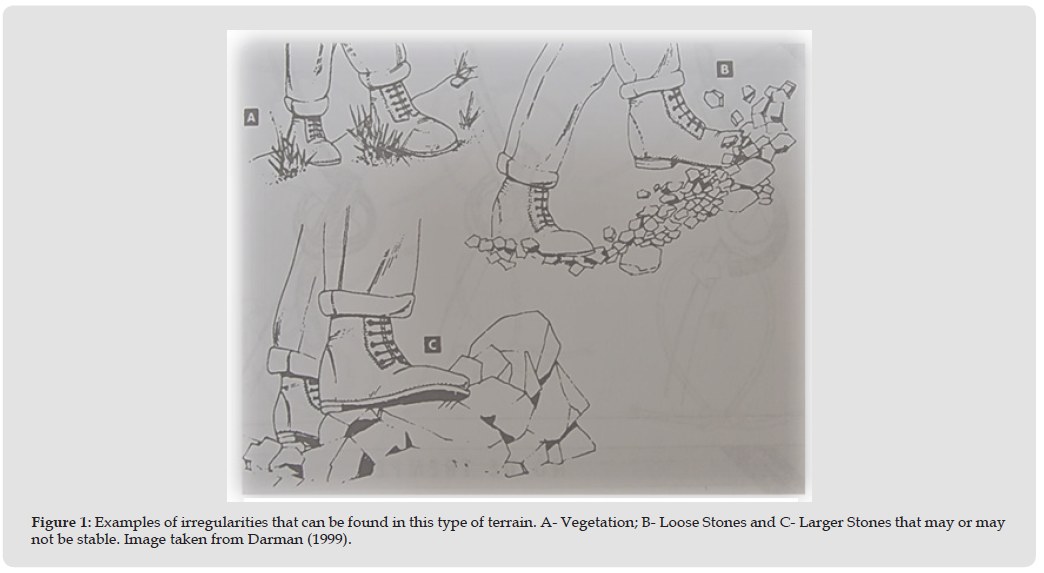 The terrain with irregularities, whether stones, vegetation, sinuosity’s of the terrain or other types of obstacles, can prevent a regular displacement (which may have its advantages when we focus attention on the modification of the individual, on his training, but which will certainly have more costs in the displacement itself - a proof of the new capabilities of the new reference framework of the knowledge tool used) (Figure 1), modifying, in particular, the rhythm, the distance between steps, the cadence of the pace, the times of the pace, the direction of the route, among other variations that can be caused by these characteristics. There is a consensus in the literature that the variation in the gait pattern leads to an increase in the energy cost necessary to carry out a given route [6-9]. According to O’Connor, Xu, & Kuo [9] the energy cost increase is mainly due to two reasons, for one hand, active movement corrections require a muscular effect, on the other hand steps variability (width) is less energy-efficient. All these constraints will imply that the individual is permanently reading the terrain, making decisions about where to place the steps and the best strategy to carry it out, as well as the necessary motor adjustments to carry out the displacement.