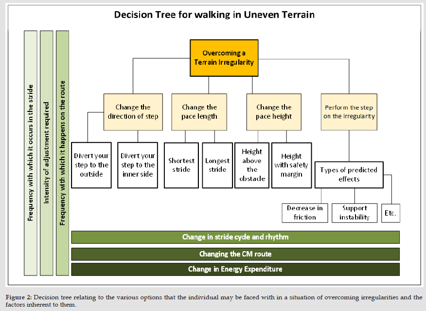 This constant adaptation has energy costs at the motor level, but also at the nervous level [7]. In these circumstances, it is important to identify the possibilities that arise to overcome the irregularities of the terrain in order to systematize not only the decisions that the individual can make, but also to understand what type of adjustments are possible to provoke (Figure 2), that is, the inherent demands. Concretizing the choices that are made at the time we move, if an irregularity is identified in the terrain in the place where we would naturally place the next step, it can be solved by: changing the direction of the step, deviating and/or bypassing it; change the pace length to overlap it (when the height of this irregularity does not disturb the normal pace height); change the height of the pace in order to vertically contour the irregularity; perform the step on the irregularity by adjusting the way the support is placed to the characteristics of the irregularity and the effects we expect it to have on it (we may have to increase the stability of the joints if the deformation of the tread is expected, we may have to adjust the direction of the force in order to maximize the compression force and minimize the slip force, If a decrease in friction is expected, we may have to change the characteristics such as direction, length, height, among other possibilities). The decisions to be made must be considered according to the conditions of the context, but also to the characteristics of each individual, in order to opt for that situation in which he is more proficient and consequently will have less change in his performance regarding the circumstances.