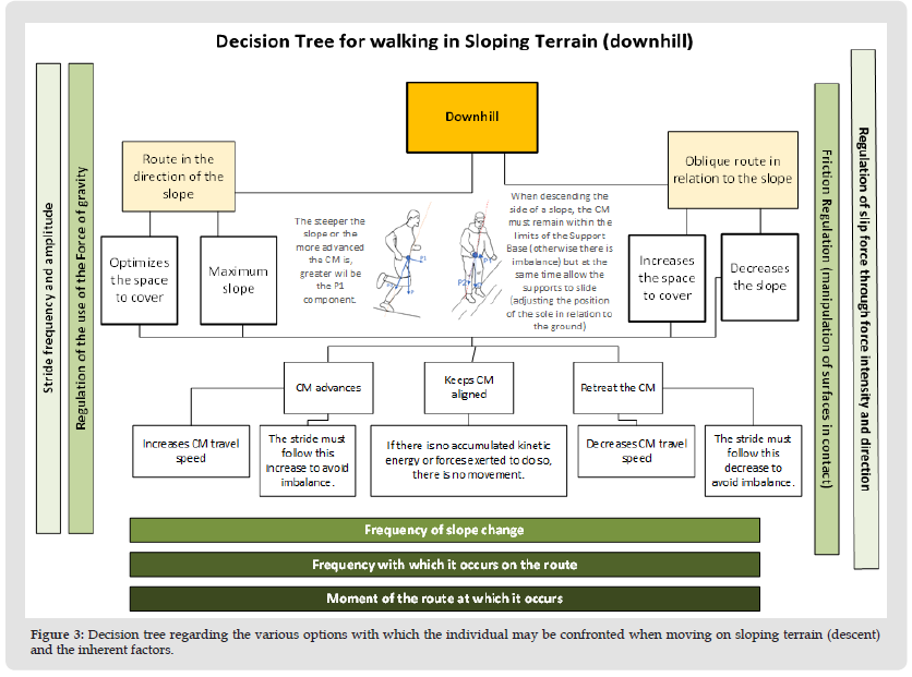 Routes on sloping terrain, in the case of descents, allow a part of the force of gravity to be used to generate the movement of displacement itself. Knowing how to use this force in an efficient, systematic and less flawed way (as opposed to a more empirical process made up of mere experiential situations) implies understanding the variables inherent to movement, but also being able to operationalize the appropriate techniques so that the benefits are greater than the costs of their use in displacement. Several difficulties in moving downhill are mentioned, which often overlap with the search for energy efficiency that the descent of a slope can provide, namely, the constant braking of movement and impacts on joints [10-12] and the search for stability to the detriment of gravity [13]. The need to adapt to the context and situation is fundamental to achieve the desired objectives in a cost-effective way [11]. Thus, knowing how to consider the possible strategies for displacement and what are the expected implications in the decisions we make is essential to manage the activity. AS mentioned by Wong, Selinger, & Donelan [14] it is necessary to have a global notion of the problem and of the interactions that different variables establish between themselves “Furthermore, whether a particular change in coordination will gain an energetic benefit depends on the walking task: decreasing step frequency, for example, may be beneficial when walking downhill but not when walking on the level.
