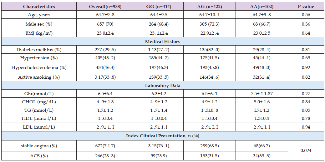 A total of 938 CAD patients, which contained 672 stable angina and 266 ACS. Baseline characteristics were well match across the AhR phenotype are summarized in Table 1. The distribution of the AhR genotypes were 414 (44.1%), 422 (45.0%) and 102 (10.9%) for GG, AG and AA, respectively. Thus, 524 (55.9%) patients were combined (AG+AA) genotype. According to genotypes were increased significantly in ACS patients compared with the SA groups P<0.05, Figure 1. These results suggested that AhR polymorphisms were related to ACS pathogenesis.