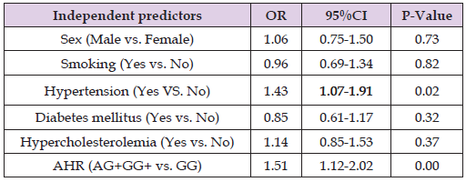 To determine predictors of ACS, a univariate regression analysis was performed to evaluate. The impact of sex, hypertension, smoking, diabetes mellitus, hype-rcholesterolemia and AhR phenotype (Table 2). We found that the ACS risk associated with the variant genotype of AhR, and hypertension increased significantly. The combined (AG+AA) genotype allele (OR: 1.51, 95%CI: 1.12-2.02, p<0.001) and hypertension (OR:1.43, 95% CI:1.07-1.91, p<0.05) were significant predictors of ACS.