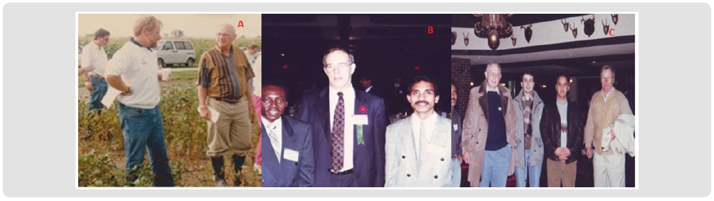 (a) Prof. Jack W. Tanner (MSc. Supervisor, in boots, brown pants) and Don Mc. Lure (in white T-shirt, Crop Science Graduate classmate and same supervisor, a breeder in a private company). As a member of the Canadian Seed Grower Association (CSGA), Prof. Tanner and team examined new varieties of soybeans that were tested multi-site before being recommended. I was required to take a ride in prof. Tanner’s car around a number of Ontario locations/farmers, conducting inspections. (b). Prof. Dave Hume (Crop Science Department’s Chair, center) and Sam Essah (Mhs. Post Ghanaian), Prof. Hume was awarded Fellow CSA, ASA, SCSA, at the third conference of this body in Cincinnati, Ohio, USA, 1993. (c). Prof. Lyn Kannenberg (coordinator mhs. Postgraduate, Crop Science, beside me, at the end wearing a black sweater), John Poppy and Darius (Mhs. Post, center), a senior corn breeder from a private company, colleague of Prof. Kannenberg, attended the Corn breeding conference, Bettendorf, IOWA, USA, 1994, as the closing of the Corn Breeding lecture supervised by Prof. Kannenberg.