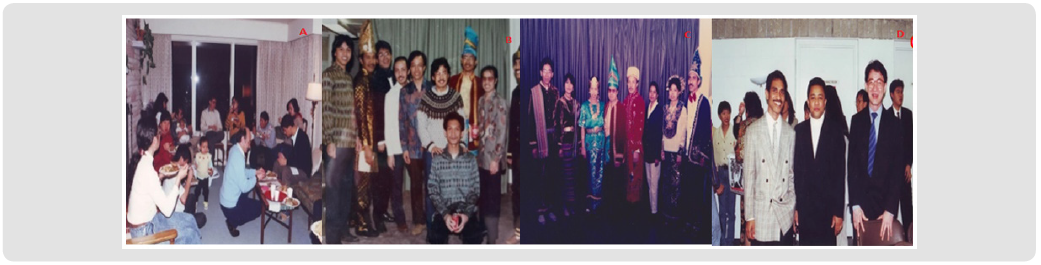 Enjoy day life in Guelph: hanging out with Canadian and Indonesian friends, celebrating birthdays, entertaining each other with available music instruments. (a). Cal and Laura Klager, Sam Esah, the Bonengs (Jus and Helly and the children), Subi, Indian-Canadian brothers. (b). Edy (businessman from Surabaya) from Toronto and other partners, (c) Martin and Subi, (d) Non Norimarna, Martin Nanere).