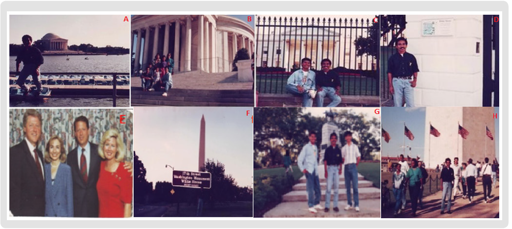 (a) With Lake Potomac and the Lincoln Memorial Washington DC. USA at the background (b, c, d) Posing in front of Lincoln Memorial Hall and the White House, President Bill Clinton (d) is not at the residence (information from nearby officers). (e, f, g) Take pictures and record the atmosphere around the Washington Monument.
