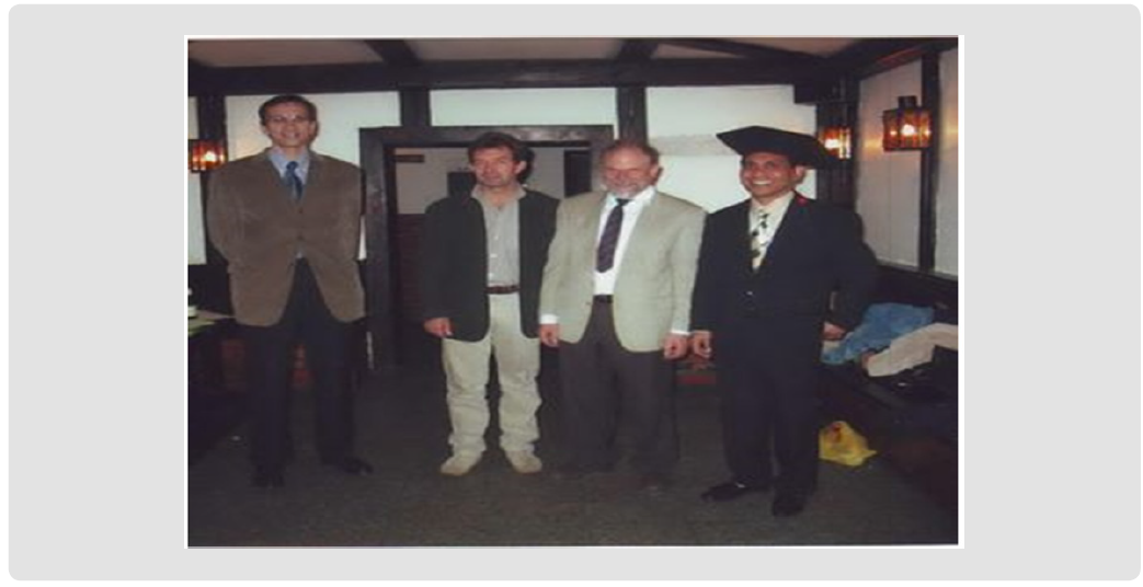 After defending the dissertation, posing with Prof. Dr. W. E. Weber, (Doctor Vater/Promoter), standing aside, Dr. Zoglauer, Techniche Universitaet (TU) Berlin (Guest examiner), center, Prof. Dr. Andreas Granner, Director of IPK Gatersleben, Head of Department of Gene Bank, IPK Gatersleben (Advisory Committee, Examiner).