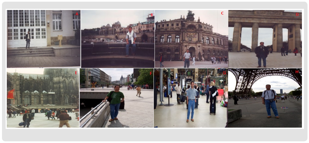 (a). Standing at the door of the Goethe Institut Dresden, here we deepen the German language for 4 months then take the DSH test before continuing our education, geographically the Goethe Institut is in the area of the Neue Stadt (new city of Dresden) bounded by the river Elbe with the Alte Stadt (Old Town) which is filled with old architectural buildings with extraordinary beauty. (b) sitting on a bridge against the backdrop of the beautiful and magnificent Frauen Kirche, heavily damaged by allied bombardment at the end of World War II (the war was over but Dresden was bombed as well), the church was later renovated exactly as the original using the latest technology. (c) Semper oper, the famous theater. From Dresden (as well as from other cities in Germany) students can reach various cities in Germany and even in Europe including (d) Berlin with its Brandenburger Tor, usually a symbol of presence in Germany, (e) Cologne with its Koelner Dom, (f) Hannover with its wide streets and (g, h) Paris with its Eifel tower