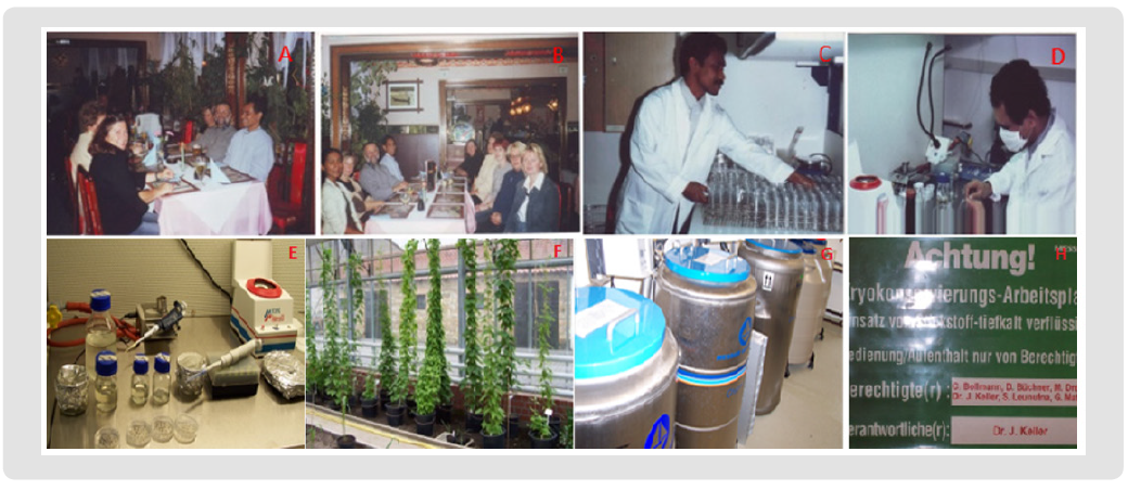 (a), (b) Colleagues (Mit-arbeiterinnen) at In-vitro Kultur und Kryokonservierungslaboar (Department of Gene Bank IPK Gatersleben, Head of Lab. (Working Group Leader) Dr. Joachim Keller (wearing a gray sweater) flanked by me and Frau Doris Buechner (Chief technicians/Secretary Dr. Keller), Frau Dr. Angelika Senula (in black jacket), Frau Carolla Bollmann, Frau Gaby Matzig and a number of other colleagues and Sheron Verenasuria Student work from Bangladesh At a meal in the small town of Quetlinburg, Frau Isburga Hoffman and Frau Marion Dreiling-Grube and senior researcher Frau Dr. Shaefer Menuhr were absent. (c), (d), (e), (f) Each stage of work is carried out with the latest, fully available equipment and materials. (g) The collection room of the preservation (h) is restricted to security purposes only.