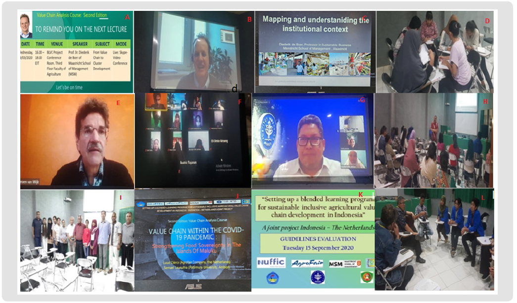 The value chain course is completed in a hybrid or blended learning system (on-line; recorded lecture or direct virtual meeting and face to face meeting), core material was delivered by Dr. Diederik de Boer and Dr. Jeroen Van Weyk from MSM Netherlands and Dr. Idqan Fahmi from SB-IPB Bogor, implications in the context of agriculture delivered by guest lecturers from Agrofair company, Faculty of Agriculture Unpatti, BPTP Maluku, Maenusu family company, kamboti Spice Maluku, and the Dutch Maluku business society. (a, b) invitations and reminders of lectures Prof. diederik de Boer, MSM from Maastricht Netherlands (video conference), (c) lecture material section and (d) class group work. (e) lecture by Prof. Jeroen van Wijk, MSM from the Hague Netherlands (virtual), (f) participating students. (g) Lectures from Dr. Idqan Fahmi, IPB Bogor, from Bogor, Indonesia, virtually and (h) face-to-face. (i) Face-to-face lectures of guest lecturers, Mr. Frans Palijama, Mr. Jailani Lating from Kamboti Spice Maluku and Mr. Charlie from the business society of Maluku, Netherlands attended by Mr. Marfin Lawalata, SP., MScdari Agrbisnis Faperta Unpatti. (j) Closing lecture from Mr. Luud Clercx, Agrofair Company, Netherlands and Dr. Semuel Leunufna, Faperta Unpatti, Ambon (k, l) Evaluation of the implementation of the lecture program.