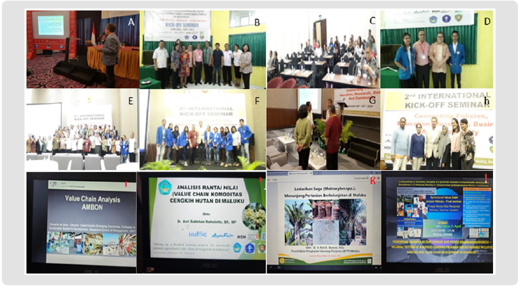 (a) Mr. Luud Clercx from Agrofair Company, Netherlands, BLVC Project Manager delivered a speech and explained the project objectives at the opening of the first Kick off seminar (2018), (b) Dean of the Faculty of Agriculture. John Matinahoru and Mr. Luud Clercx pictured with a number of keynote speakers and BLVC project student supervisors, (c) Seminar Participants on Swiss-Bell Hotel Ambon (d) organizing committee and main speakers Dr. Idqan Fahmi from IPB Bogor and Dr. Semuel Leunufna from Pattimura University Ambon. (e) Participants The second kick-off-seminar, the first day, took place at Santika Hotel, Tantui Ambon, officially opened by assistant IV to the Governor of Maluku, (f) Mr. Luud Clercx and Dr. Idqan Fahmi pictured with the organizing committee, students participating in the Maluku Typical Agricultural Value Chain Analysis course, (g) Special guest, Mr. Atus Leleury, Vice Bupat of Central Maluku discussed with the leaders and organizers of the BLVC Project. (h) Mr. Luud Clercx with representatives of small businesses Kamboti Spice Maluku, guest lecturers at the Value Chain lecture and keynote speaker of the Seminar. Several presentations at the final Webinar of the BLVC project. (i) (Value chain Analysis by Prof. diederik De Boer, Maastrich School of Management (j) Clove Value Chain Analysis by D. Asri Mahulette, Pattimura University and (k) Sago Preservation to Support Maluku Islands Agriculture by Dr. Rein Senewe, BPPT, Maluku. (k) The webinar concluded a total of eight main conclusions from the overall implementation of the project for more than 3 years at the Faculty of Agriculture, Pattimura University as a beneficiary institution with session leaders Mr. Luud Clercx from Agrofair Company, Netherlands and Dr. Semuel leunufna from Pattimura University, Ambon.