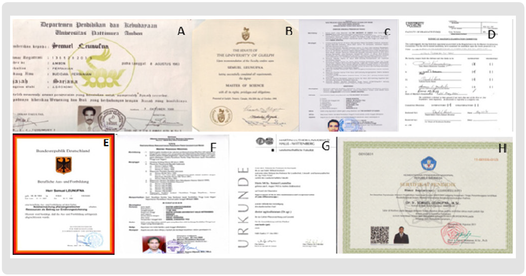 (a) Undergraduate degree at the Faculty of Agriculture, Pattimura University, Ambon, (b) trata 2, MSc at the Crops Science Department of the University of Guelph, Guelph, Ontario, Canada. (c) Ratification of MSc Certificate by the Directorate of Higher Education of the Ministry of Education and Culture of the Republic of Indonesia, (d) Thesis examination documents carried out by professors; Prof. Lyn Kannenberg (coordinator Graduate Students)), Prof. Jack W. Tanner (Supervisor), Prof. Dave Hume, Department’s Chair, Advisory Committee), Prof. Tom Michael (Advisory Committee), Prof. Bruce Luzi (Examiner, Georgia USA, will occupy the position of Soybean Breeder replacing Prof. Tanner). (e) A year’s training certificate in Germany, utilization of plant genetic resources as a contribution to food security. (f) diploma (Doctor of Agriculturarum, Dr. Agr.) Martin Luther Universitaet Halle-Wittenberg, Germany, (g) Ratification of S3 Certificate by Higher Education (h) Certificate of Lecturer Certification by the State, stating that the person concerned is a Professional Lecturer in the Field of Plant Breeding.