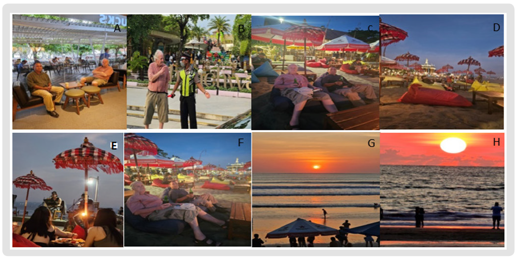 In his 80s, Mr. Anema still flies through the time zone between the Netherlands-Ambon-Bali planning and completing various works. While discussing and publishing joint manuscripts related to biodiversity conservation of small islands and the institution “Center for the Conservation of Maluku’s biodiversity”, (EJAS, 2023) we enjoyed beer, koffee and dinner at a number of restaurants in Kuta, Seminyak, Sanur or ushered in sunset while listening to music and enjoying the beautiful beaches of Kuta (a), (b), Legian and Seminyak (c)-h).