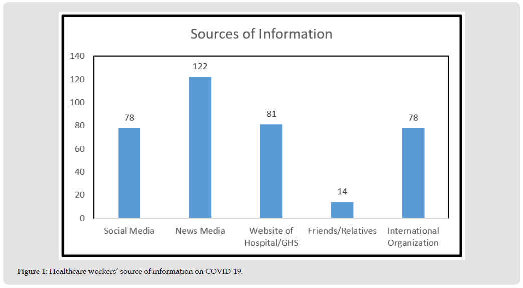 Healthcare workers’ sources of information regarding COVID-19 are represented in Figure 1. Most healthcare workers received information regarding COVID-19 from the news media (32.7%, n=122), and 21.7% reported they obtained their information from the website of their hospital. Others remarked on social media (20.9%, n=78) and international organisations, such as the WHO (20.9%, n=78). Few reported receiving information from friends and relatives (3.8%, n=14).