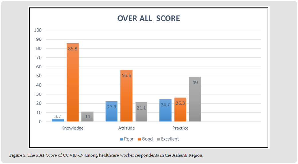 Findings from the study revealed that 11% had exceptional knowledge, and a few (3.2%) had limited knowledge of COVID-19. They obtained less than 60% on the knowledge questions. Most respondents, indicating 85.8%, had good knowledge of COVID-19 (Table 2). The study revealed that 56.6% of the healthcare worker respondents had good attitudes towards COVID-19 whereas 22.3% had poor attitudes. (Table 3). Less than 50% of the healthcare worker respondents had excellent practices towards COVID-19 prevention in the Ashanti Region (Table 4). The KAP scores are also presented in Figure 2. The results from the bivariate analysis revealed there was a significant positive association between the healthcare worker respondents’ attitudes and practices towards COVID-19 (p=0.022). The respondents’ good attitude related positively to their knowledge of COVID-19 (p=0.048) (Table 5).