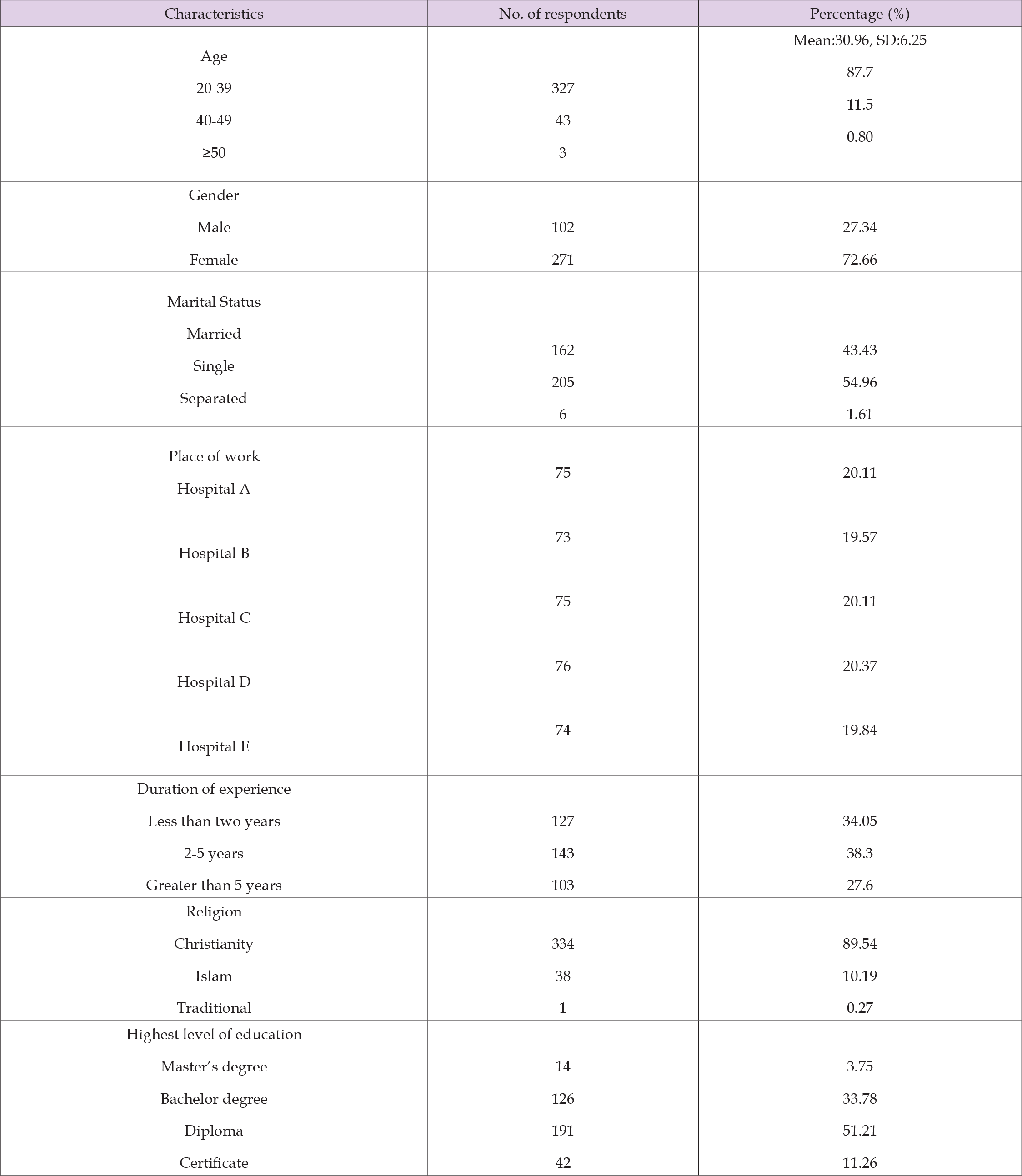 In our study,373 healthcare workers filled out questionnaires received from all the facilities. The mean age was 30.96 years (SD=6.25; ranged,20-39) Table 1. shows the demographic characteristics of the participants.