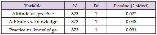 Table 5: Bivariate analysis of healthcare workers’ knowledge, attitudes, and practices towards COVID-19 by using the Chi-Square.