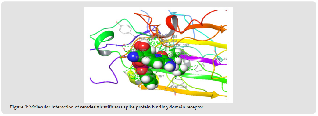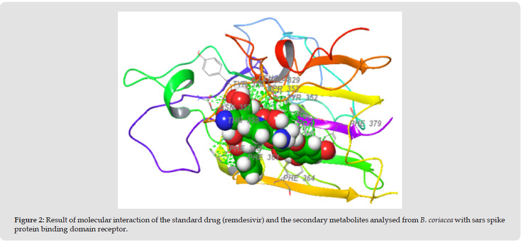 Table 2: Docking score of SARS spike protein receptor binding domain (2GHV) with the secondary metabolites analysed from B. coriacea and remdesivir as the standard drug.