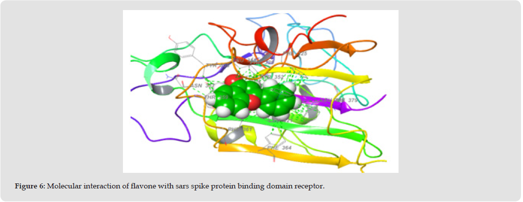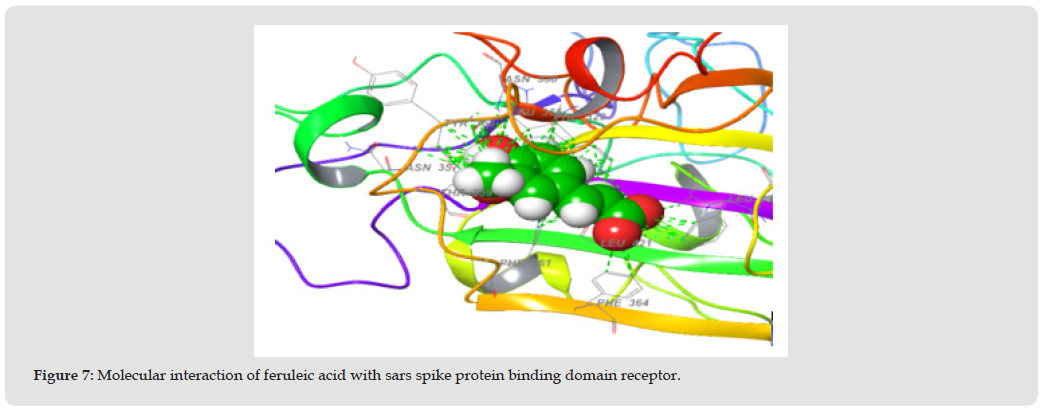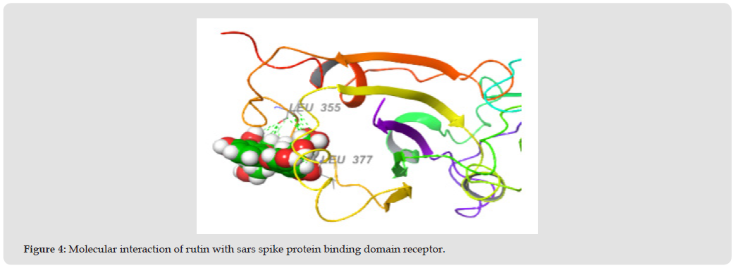 Deletion studies have shown that the 80R epitope on S1 is located in the minimal ACE2 binding domain, between residues 324 and 503 (Sui, et al. [23]). Terpenoid compounds used in this study were extracted from Buchholzia coriacea. Using Gas Chromatography-Mass Spectrophotometer (GC-MS), the compounds were quantified and characterized to give rutin, gallic acid, caffeic acid, ferulic acid, flavone, and phenol which have strong antioxidant properties. This study tends to predict the best inhibitor for SARS spike protein receptor binding domain (2GHV) from terpenoid compounds of Buchholzia coriacea using molecular docking approach. The binding affinity of the standard drug remdesivir was compared with other ligands of the compounds derived from B. coriacea. After docking of the phytochemicals with SARS spike protein receptor binding domain, the docking scores were as follows; rutin -7.545 kcal/mol, caffeic acid -7.297 kcal/ mol, flavone -7.276 kcal/mol, ferulic acid -6.696 kcal/mol, gallic acid -6.071 kcal/mol, phenol -4.732 kcal/mol and remdesivir -4.740 kcal/ mol [24-38]. From the result of ADME analysis, the blood brain barrier permeability of the tested compounds was nearly between the acceptable ranges which is very important for a drug to pass through those barriers rutin, gallic acid, caffeic acid, ferulic acid, flavone, and phenol showed QPlogBB value of -4.278, -1.661 -1.559, -1.066, 0.078, and 0.101 respectively.