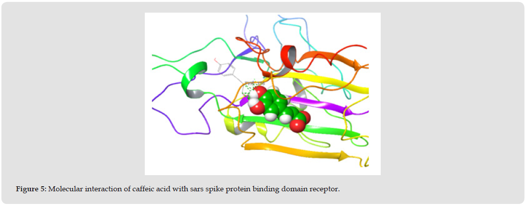 Rutin, caffeic acid, flavone, ferulic acid, gallic acid and phenol showed solvent accessible surface area value of 767.872, 389.661, 457.137, 408.488, 341.213 and 276.612 respectively where the acceptable range value is 300.0-1000. All compounds sailed through the solvent accessible surface area value except phenol which could not meet up the acceptable range. Predicted IC50 value for blocking Human ethera- go-go related gene (HERG) K+ channel for caffeic acid, ferulic acid, gallic acid and phenol were in the acceptable range (below -5), while rutin (-5.127) and flavone (-5.451) were above the acceptable range. The predicted octanol or water partition coefficient for the compounds were also analysed rutin, caffeic acid, flavone, ferulic acid, gallic acid and phenol showed -2.567, 0.539, 3.553, 1.389, -0.577 and 1.459 respectively where the acceptable range is -2.0-6.5. Human oral absorption rate was greater for flavone (100%), phenol (100%), ferulic acid (68.81%), caffeic acid (54.072%), gallic acid (41.457%) and rutin (0%) [60-70]. where the acceptable percentage < 25% is poor and > 80% is good. Caffeic acid, gallic acid and ferulic acid with the binding affinities -7.297 kcal/mol, -6.071 kcal/mol and -6.696 kcal/ mol greater than the binding affinity of the standard drug (remdesivir) -4.740 kcal/mol sailed through the 8 ADME analysis. Therefore, they could be lead compounds in the treatment of SARS-COV [71-74].