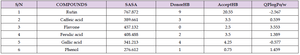 Where the acceptable range is -3.0 to 1.2, rutin could not adhere to the QPlogBB result therefore, would not be able to penetrate blood brain barrier while the remaining compounds sailed through. The secondary metabolites: rutin, gallic acid, caffeic acid, ferulic acid, phenol and flavones showed the number of hydrogen bonds donor value of 9, 4, 3, 2, 1 and 0 respectively. Where acceptable range is 0.0-6.0 and also showed the number of hydrogen bonds acceptor value of 20.55, 4.25, 3.5, 3.5, 0.75 and 2.5 respectively. These are in the value of acceptable range (2.0-20.0) [39-59]. Rutin could not sail through the hydrogen bond donor and hydrogen bond acceptor because it has exceeded the acceptable range while phenol having the least number could also not sail through because it could not meet up the acceptable range. The other compounds were able to adhere to the range.