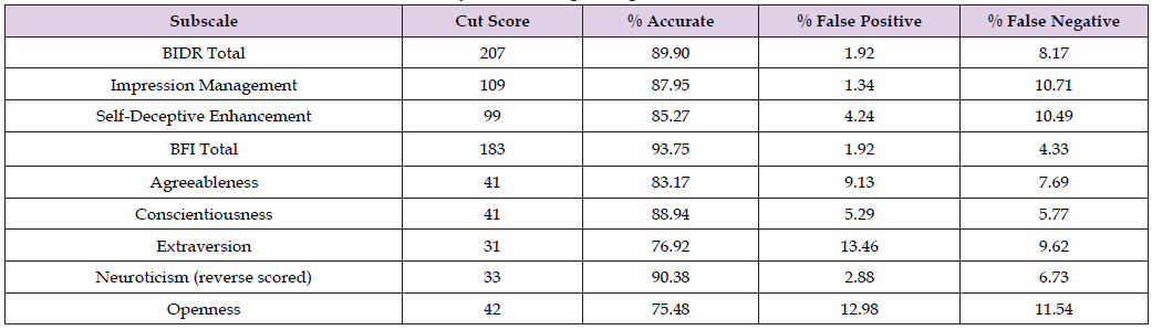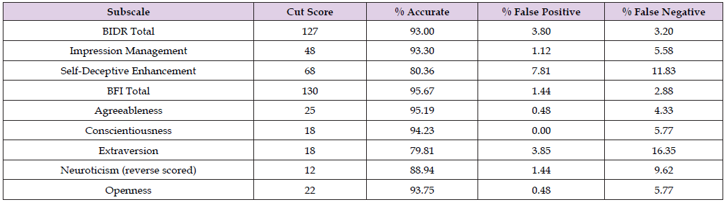 Cut scores and indices of classification accuracy are provided in Tables 1 & 2 for faking good and faking bad, respectively. Our analyses for individual subscales revealed that Neuroticism, when reversed scored, was best for detecting faking good (90.38% classification accuracy), and that Agreeableness was best for detecting faking bad (95.19% classification accuracy). At the overall instrument level, total BFI scores were better than total BIDR scores for detecting both faking good (93.75% versus 89.90% classification accuracy) and faking bad (95.67% versus 93.00% classification accuracy).