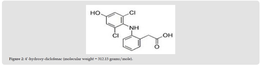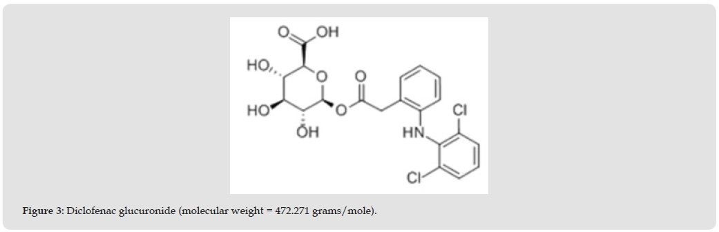 (Tang, et al. [33]) studied the metabolism of diclofenac in-vitro using human liver microsomes. The metabolism of diclofenac in humans partitions between acyl glucuronidation and phenyl hydroxylation, with the former reaction catalysed primarily by UGT2B7 while the latter is catalysed by CYP2C9. The 4’-hydroxylation of diclofenac represents a feature reaction for CYP2C9 catalysis, and this regioselective oxidation is presumably dictated by interactions of the carboxylate moiety of the substrate with a putative cationic residue of the enzyme. Lazarska et al. [34] observed that the possession of the UGT2B7*2 and CYP2C8*4 alleles are responsible of diclofenac-induced liver injury. 4’Hydroxy-diclofenac can form reactive benzoquinone imines that deplete hepatic glutathione. UGT2B7 catalyses the formation of another reactive metabolite: the diclofenac acyl glucuronide (Figures 2 & 3).