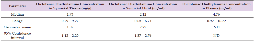 Table 7:Ratio of the concentration of diclofenac diethylamine in synovial tissue to that in plasma and the ratio of the concentration of diclofenac diethylamine in synovial fluid to that in plasma, by (Seefried et al. [35]). Table 2 shows the ratio of synovial tissue concentration to plasma concentration of diclofenac diethylamine and the ratio of synovial fluid concentration to plasma concentration of diclofenac diethylamine.