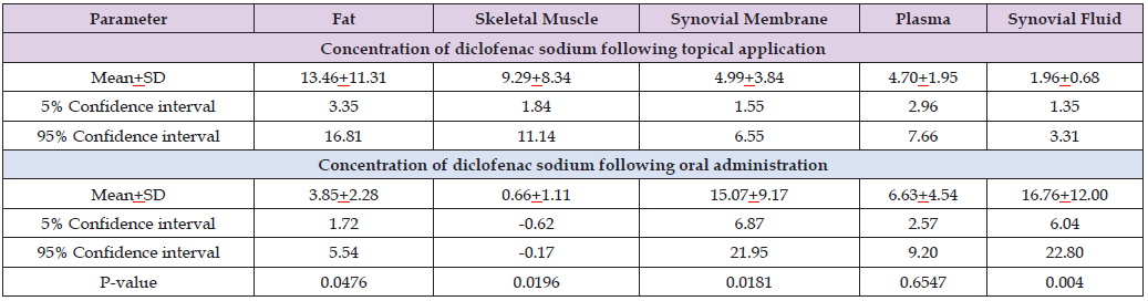 Table 2: Concentration of diclofenac sodium in fat, skeletal muscle, synovial membrane, plasma, and synovial fluid which have been obtained in 7 patients who received a capsule containing 37.5 mg of diclofenac sodium and in 7 patients who received two taps containing a total of 30 mg of diclofenac sodium, by (Miyatake et al. [36]).