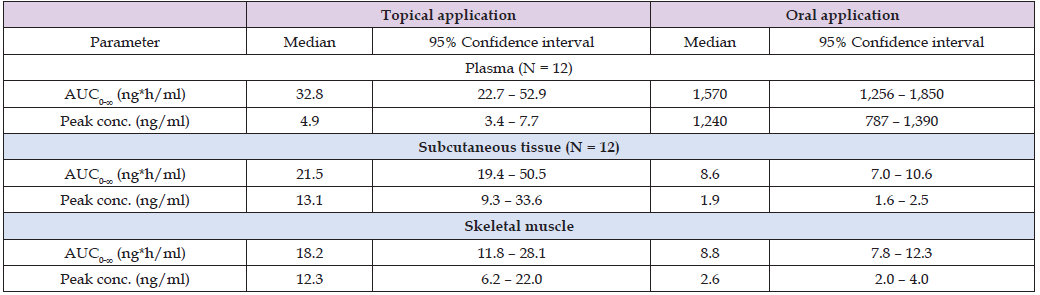 Table 3: Pharmacokinetic parameters of diclofenac which have been obtained in plasma (total drug) and subcutaneous tissue and skeletal muscle (free drug) of the thigh of 12 healthy males after the final dose of a 3 day multiple dose regimen of either topical application of diclofenac spry gel 4% or oral diclofenac 50 mg enteric coated tablets. Values are the median and 95% confidence interval, by (Brunner et al. [37]).