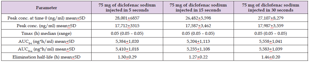 This table shows that the pharmacokinetic parameters are similar according to the three lengths of injection. Diclofenac sodium is eliminated rapidly as the