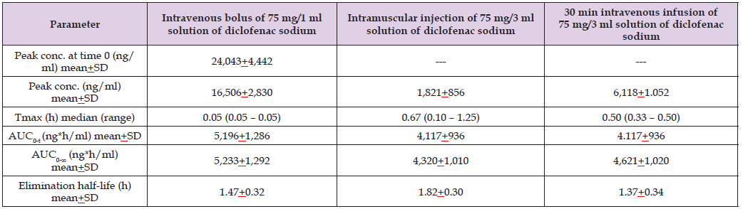 Table 6: Pharmacokinetic parameters of diclofenac sodium which have been obtained in 18 healthy women and healthy men following a single intravenous bolus of 75 mg/1 ml solution of diclofenac sodium, following an intramuscular injection of 75 mg/3 ml of solution of diclofenac sodium, and following the 30 min of intravenous infusion of 75 mg/3 ml of solution of diclofenac sodium. Values are the mean+SD or the median and (range), by (Leuratti et al. [38]).