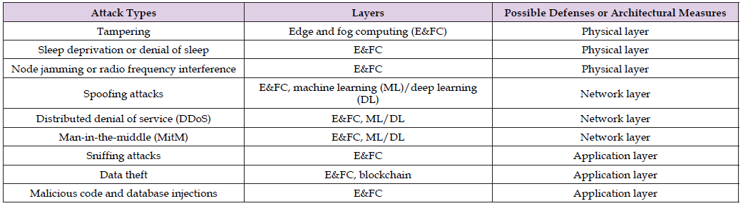 Table 2: Classification of Attack Types, the Layer Targeted by an Attack, and Possible Defenses or Architectural Measures in an Urban IoT Network.