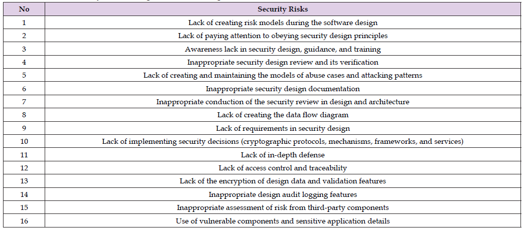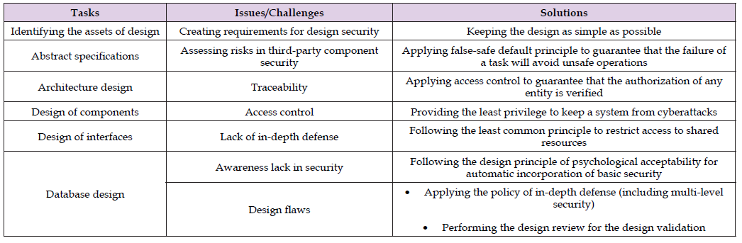 Software development security covers the security of the developmental environment, the security of software and components, application security, and the security of the developmental lifecycle (Warsinske, et al. [5]). There are possible troubles in vendor enterprises such as cyber theft. Research on developing a model of cyber security challenges helps vendors’ enterprises to recognize challenges in cyber security during software development (Khan, et al. [20]). (Table 3) lists some common security problems during the period of software design (Khan, et al. [21]). Tasks, challenges, and solutions during the period of the software design are listed in (Table 4) (Humayun, et al. [22]).