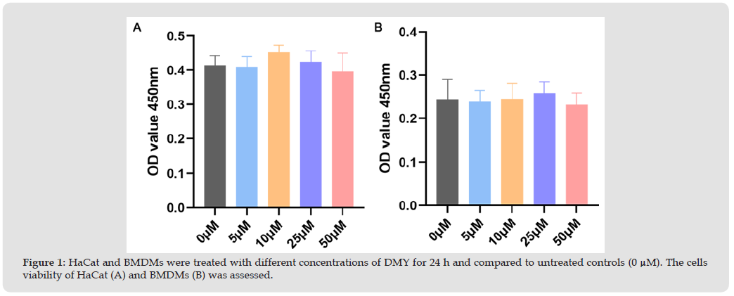 Firstly, we determined the concentration of RAW 264.7 cells (50 μM) according to previous investigation [9,10]. Next, we explored the concentration of HaCat and bone marrow-derived macrophages (BMDMs). HaCat or BMDMs were implanted in 96-well cell plates and then incubated with different concentrations of DMY (0 μM, 5 μM, 10 μM, 25 μM, 50 μM) lasting 24h. As shown in the Figures 1A & 1B, DMY had no effect on cell viability in HaCat and BMDMs, indicating that DMY was not toxic to HaCat and BMDMs at concentration 50 μM. We chose the dose of 50 μM for this study.
