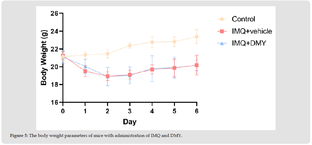 To investigate the therapeutical effect of DMY on psoriasis, we induced a murine model of psoriasis. The stimulation of IMQ resulted in the development of psoriasis-like dermatitis, then DMY ointment was administered topically. The effects of IMQ and DMY on the body weight of mice were initially examined. The results demonstrated a significant decrease in body weight among mice in the IMQ + vehicle group compared to the control group. Additionally, the body weight of mice in the IMQ + vehicle group and IMQ+DMY group exhibited an initial decline followed by an increase (Figure 5), indicating that the mice were tolerant to DMY.