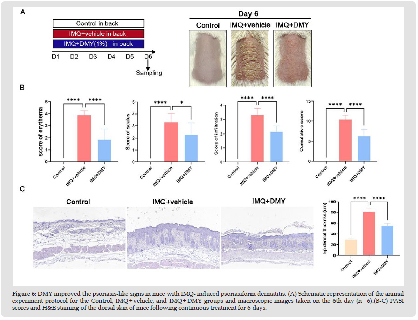 A total of eighteen male BALB/c mice (6-8 weeks of age) obtained from Hunan SJA Laboratory Animal Co.Ltd were housed in groups of five per cage under standard laboratory conditions (at 25 ◦C, 12 h light/dark cycle) with ad libitum access to food and water. The mice were randomly assigned into three groups (n = 6) as follows: Control group (untreated normal group), IMQ+vehicle group (IMQ and vehicle only), IMQ+DMY group (IMQ and DMY ointment). After one week of acclimatization, the hair in the back was removed region using a shaver and depilatory cream, leaving an area measuring 2cm×3cm, two days prior to the experiment. All treatment groups were topically administered a daily dose of 62.5 mg of 5% imiquimod cream (Aldara; 3M Pharmaceuticals) on the shaved back for five consecutive days. The DMY ointment was applied once daily after 6-8 h after IMQ administration. The collection of skin samples was conducted from all mice 6 days post- treatment.